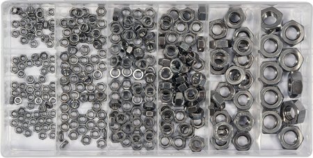 ZESTAW 300 SZTUK NAKRĘTEK NIERDZEWNYCH METRYCZNYCH ZAWIERA ROZMIARY M3, M4, M5, M6, M8, M10.
