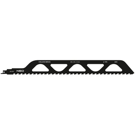 Brzeszczot do piły szablastej, HM, 455 x 50 x 1,5 mm, 2 TPI 58-032 marki NEO TOOLS o wymiarach 455 x 50 x 1,5 mm, z uzębieniem 2 TPI (skok 12,7 mm), przeznaczony jest do cięcia cegły (<405 mm) oraz betonu komórkowego. Ostrza z węglika spiekanego (HM) zapewniają trwałość w materiałach abrazyjnych, a konstrukcja umożliwia precyzyjne cięcie pod kątem. Ten brzeszczot do piły szablastej marki NEO TOOLS jest odpowiedni do szerokich zastosowań wymagających szybkiego, prostego prowadzenia i odporności narzędzia.