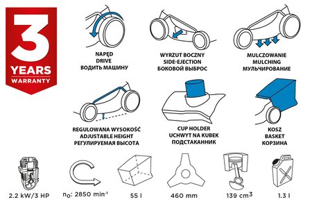 - Kosiarka spalinowa 3.0KM, szerokosć koszenia 460mm