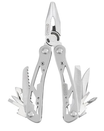 Zawiera: uniwersalne szczypce z ząbkowanymi i zaokrąglonymi szczękami oraz szczękami do przecinania drutu, brzeszczot, nóż mały, nóż duży, otwieracz do butelek, wkrętak płaski 3, 4, 8 mm, PH1, pilnik