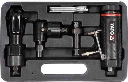 Uniwersalne narzędzie pneumatyczne 3w1 z wymiennymi końcówkami łączy funkcje grzechotki 1/2", szlifierki prostej oraz szlifierki kątowej z trzpieniem 6 mm.