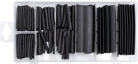 Zawartość opakowania to 127 sztuk koszulek o różnych średnicach i długościach. Kolor czarny.