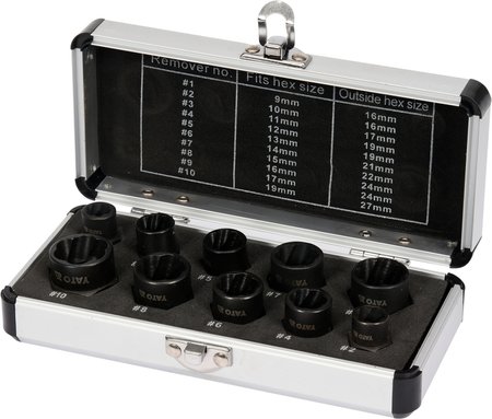 Nasadki do uszkodzonych, obrobionych śrub, nakrętek w rozmiarach 9, 10, 11, 12, 13, 14, 15, 16, 17 i 19 mm posiadają specjalny kształt umożliwiający zaklinowanie na zniszczonej śrubie lub nakrętce, dzięki czemu następuje wykręcenie uszkodzonej części.